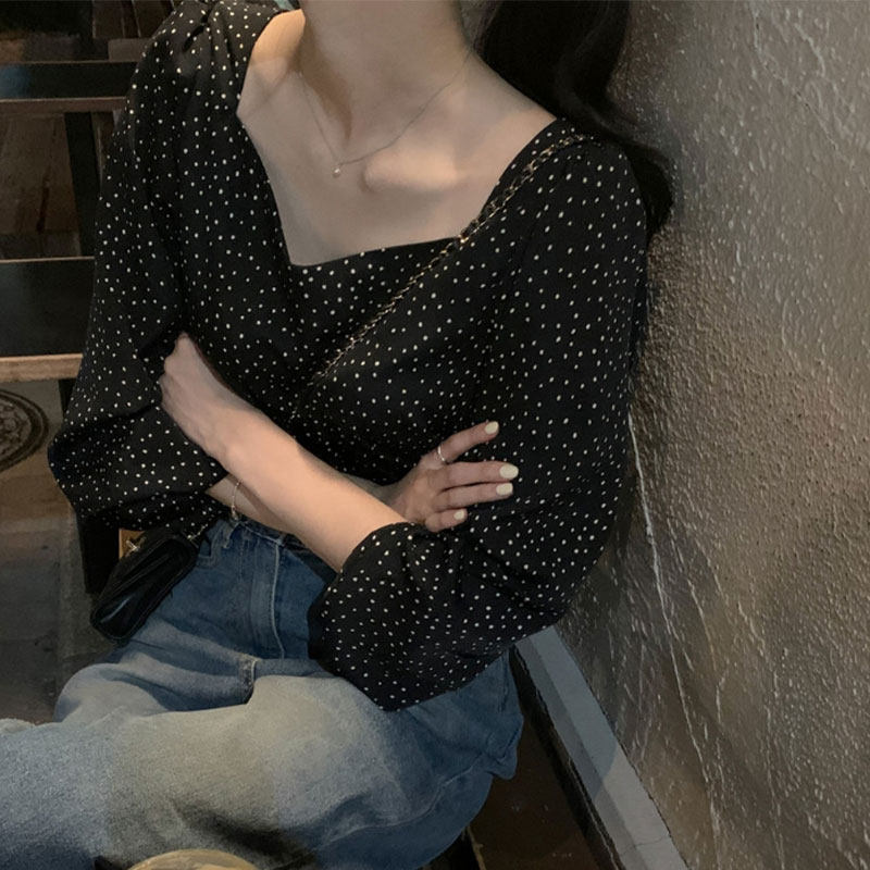 韩版高级感复古洋气气质宽松百搭长袖方领露锁骨波点衬衫上衣女潮