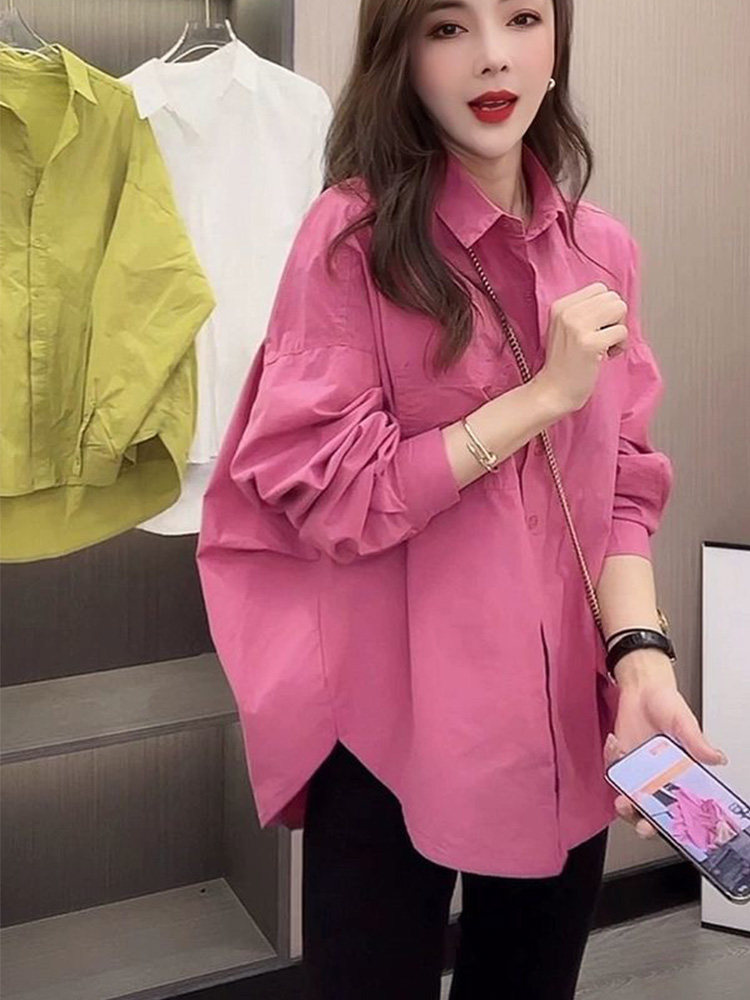 韩版纯色衬衫女中长款秋季宽松上衣2022新款外穿百搭长袖港风衬衣