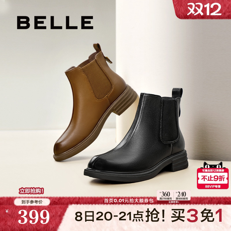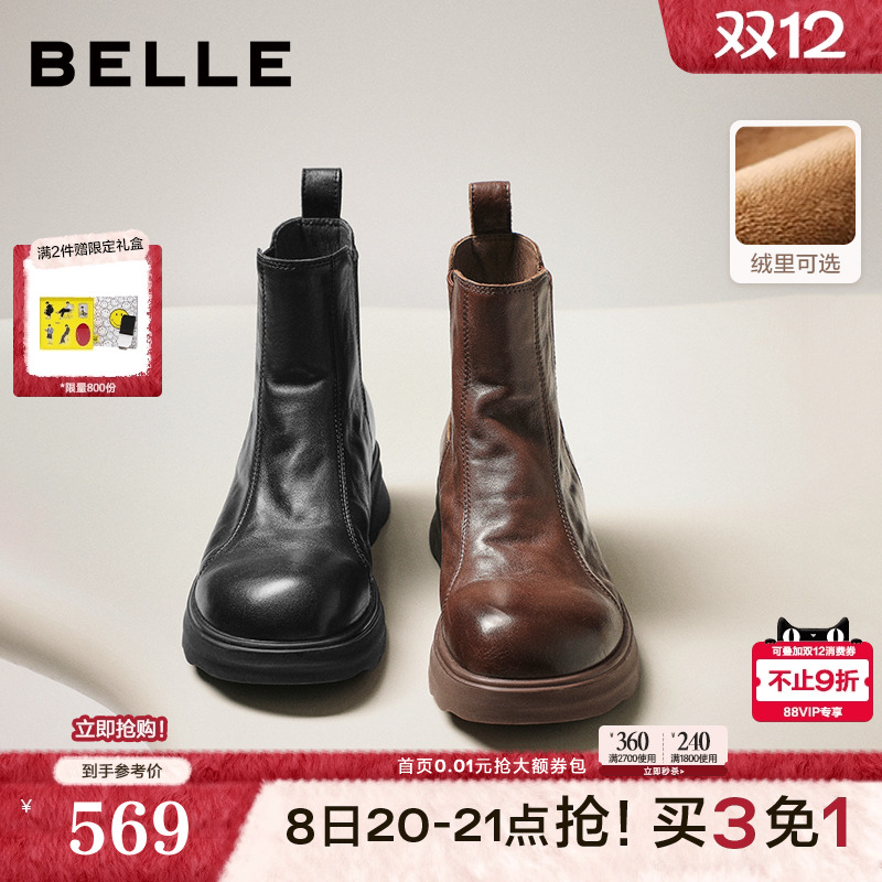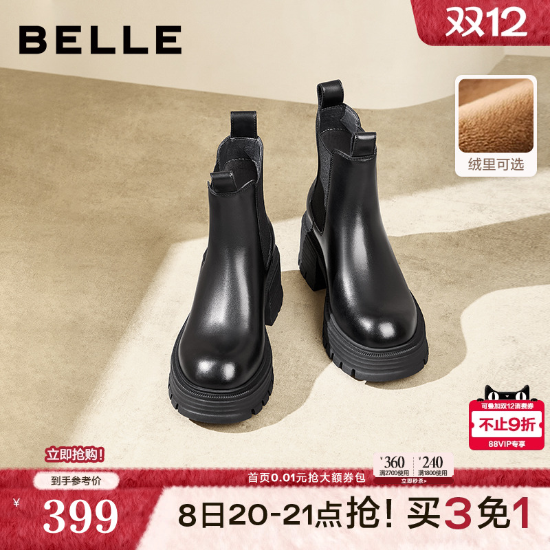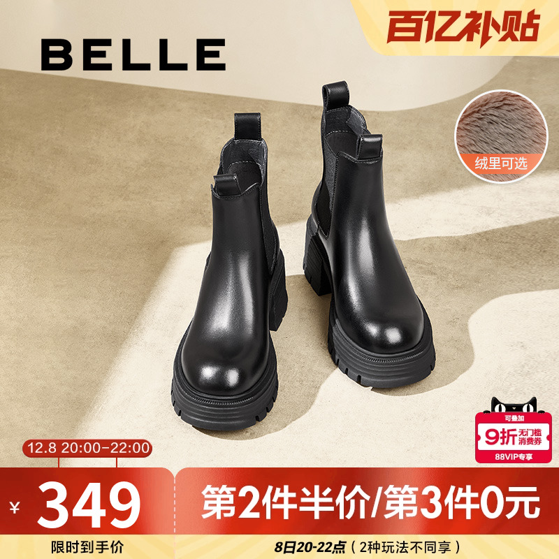 百丽女靴子新款时装靴厚底羊皮切尔西靴冬季加绒保暖短靴B7D1DDD4