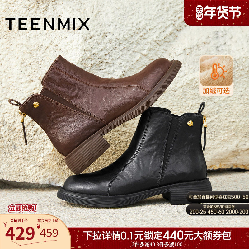 天美意复古英伦切尔西靴加绒短靴女鞋子休闲时装靴皮靴2025冬新款