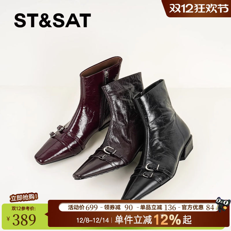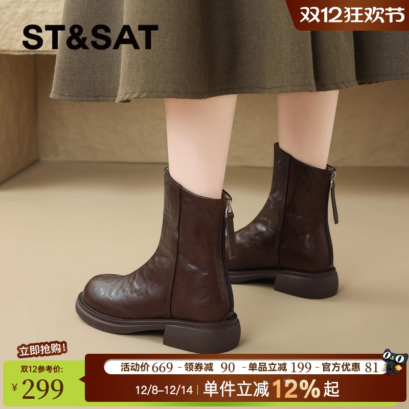 星期六黑色短靴女2025秋冬方头英伦风粗跟切尔西靴真皮侧拉链单靴
