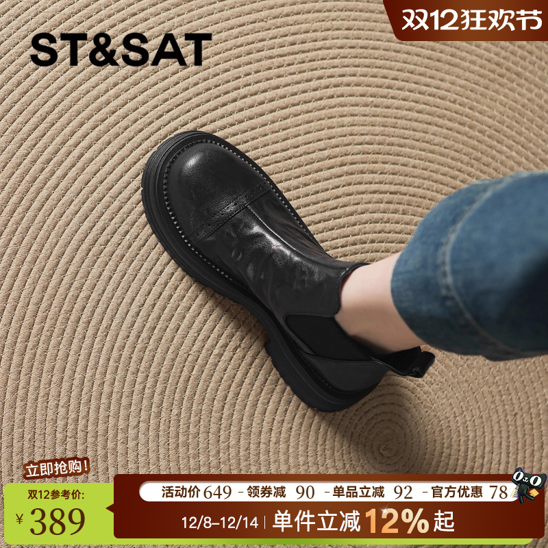星期六羊皮短靴女2025新款秋冬马丁靴黑色裸靴英伦风厚底切尔西靴