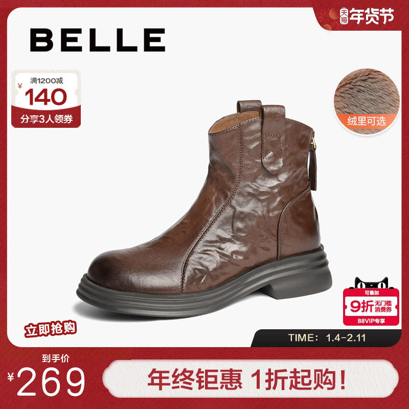百丽复古加绒时装靴女冬新羊皮褶皱切尔西靴显瘦瘦短靴子D4L1DDD4