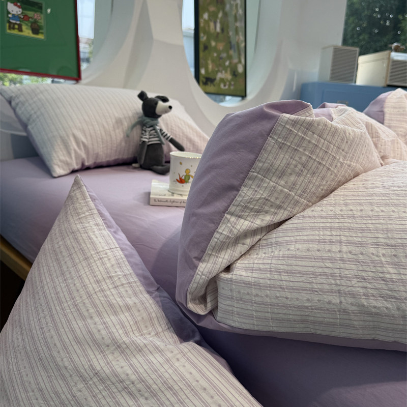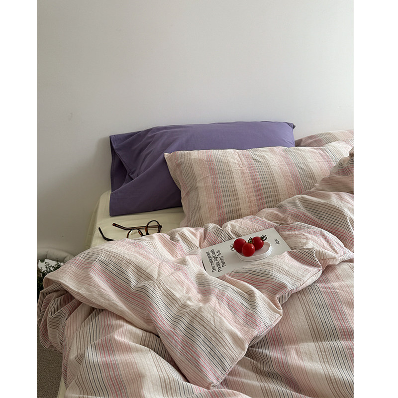 ins水洗棉简约复古浅紫色条纹四件套全棉1.5m1.8米公寓被套三件套