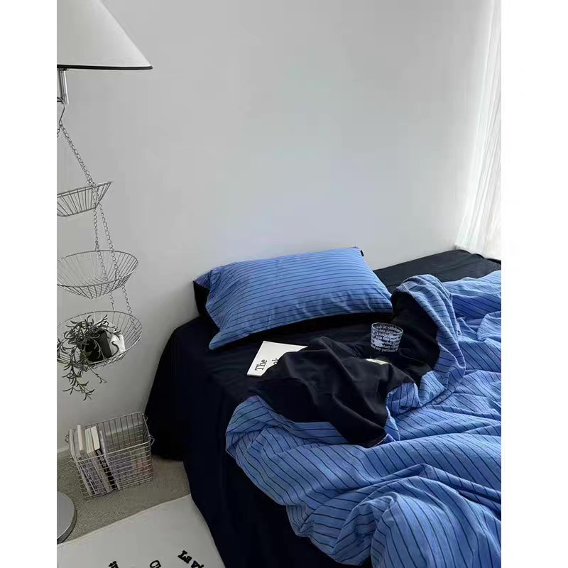 月球观察员尼克/ins韩国蓝调条纹水洗棉床单四件套纯棉被套三件套