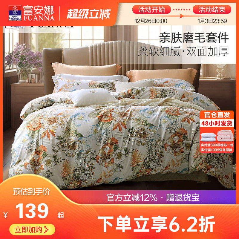 富安娜全棉磨毛四件套纯棉加厚保暖被套床单秋冬天床上用品三件套