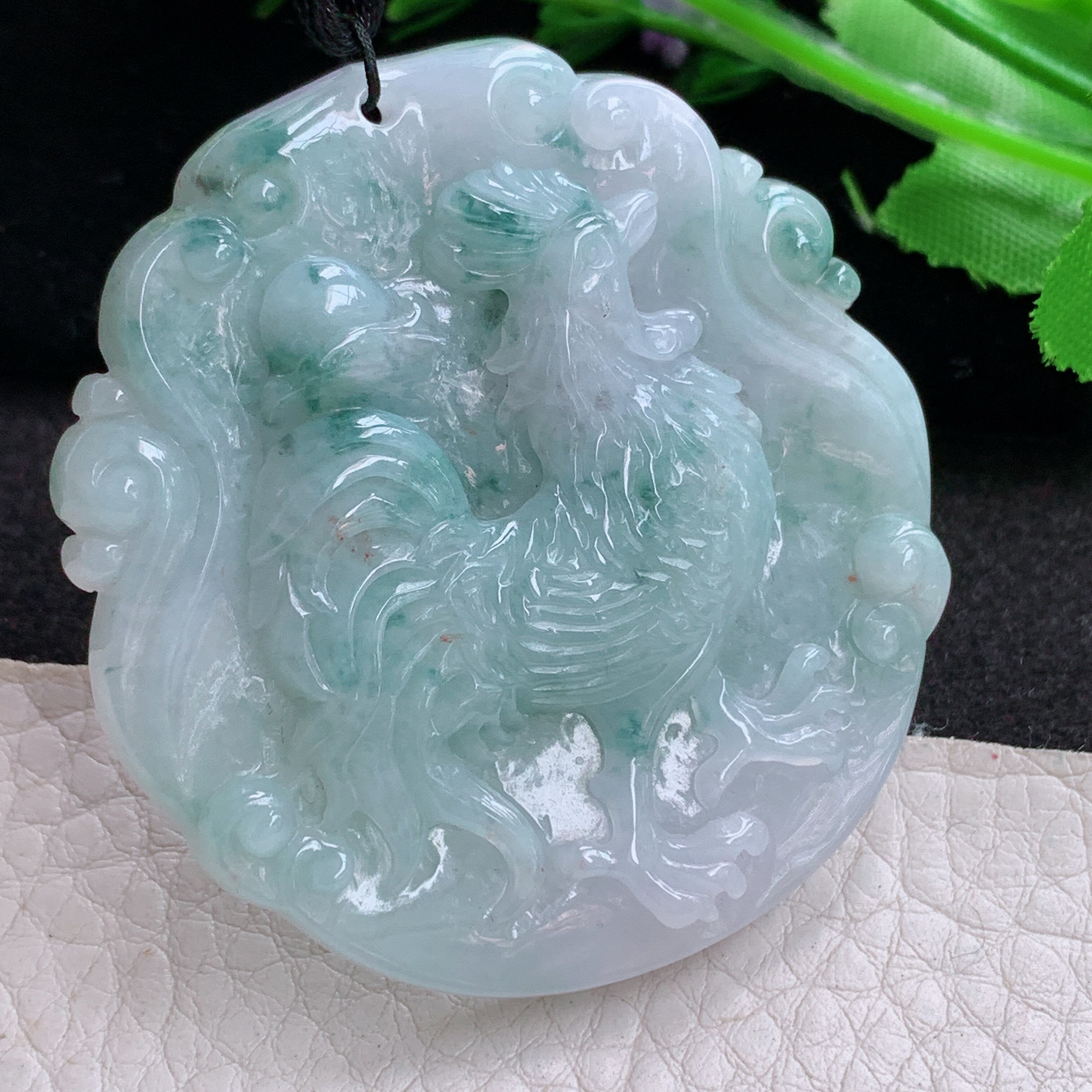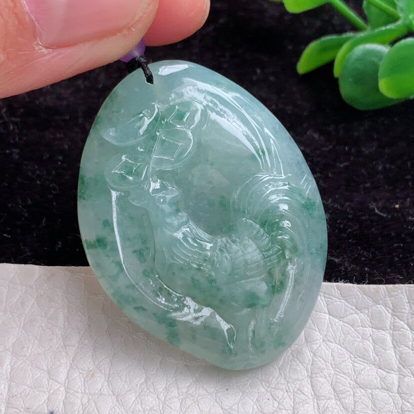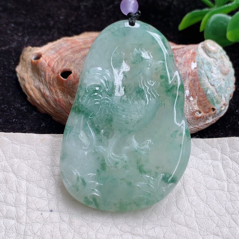t实拍 缅甸翡翠A货精美冰飘花金鸡独立 生肖鸡玉吊坠47*31*5.3