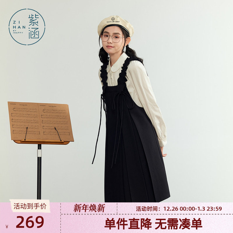 啦啦酱 铃音猫 秋冬学院风背带裙套装纯色衬衫黑色连衣裙两件套女