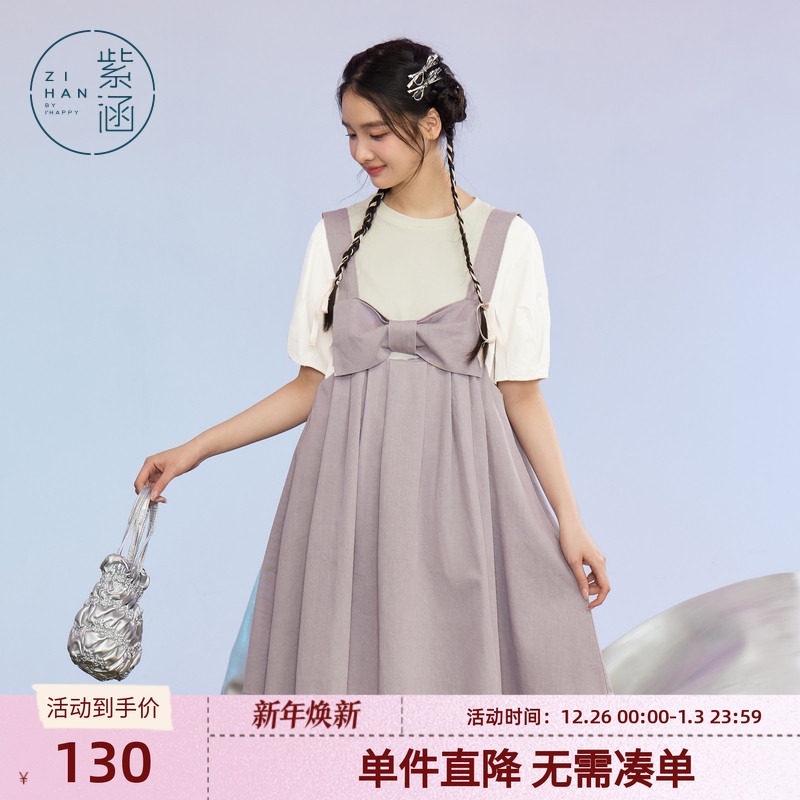 紫涵T恤蝴蝶结背带裙套装女夏季新款泡泡袖上衣连衣裙两件套装裙