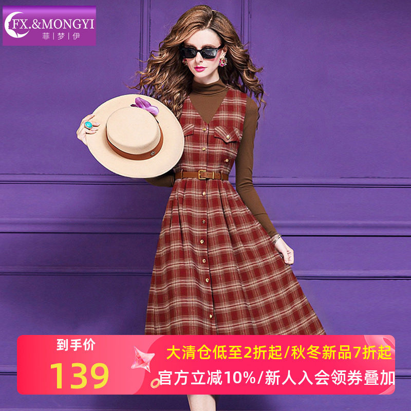 菲梦伊贵气名媛时尚套装女秋季高领打底t恤格子背带连衣裙两件套