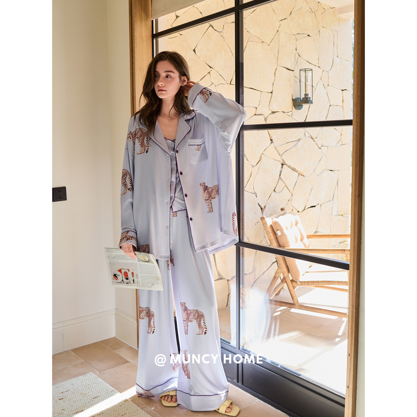 曼系“紫定豹富”莱赛尔睡衣女老钱风吊带三件套长袖家居服春秋季