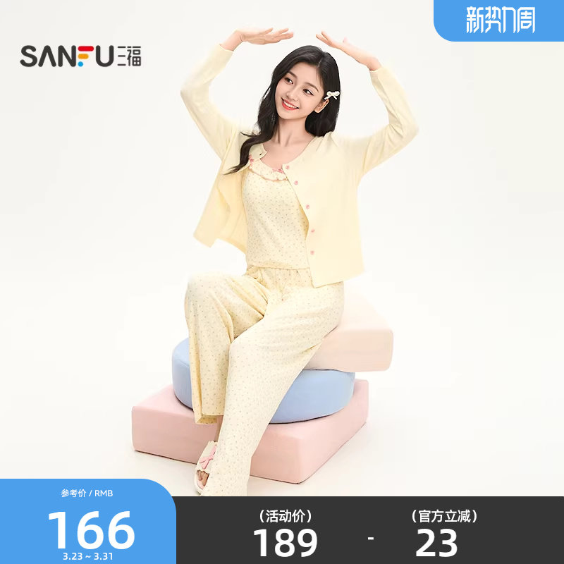 三福女春季碎花三件套睡衣 甜美韩系宽松外穿家居服女514827