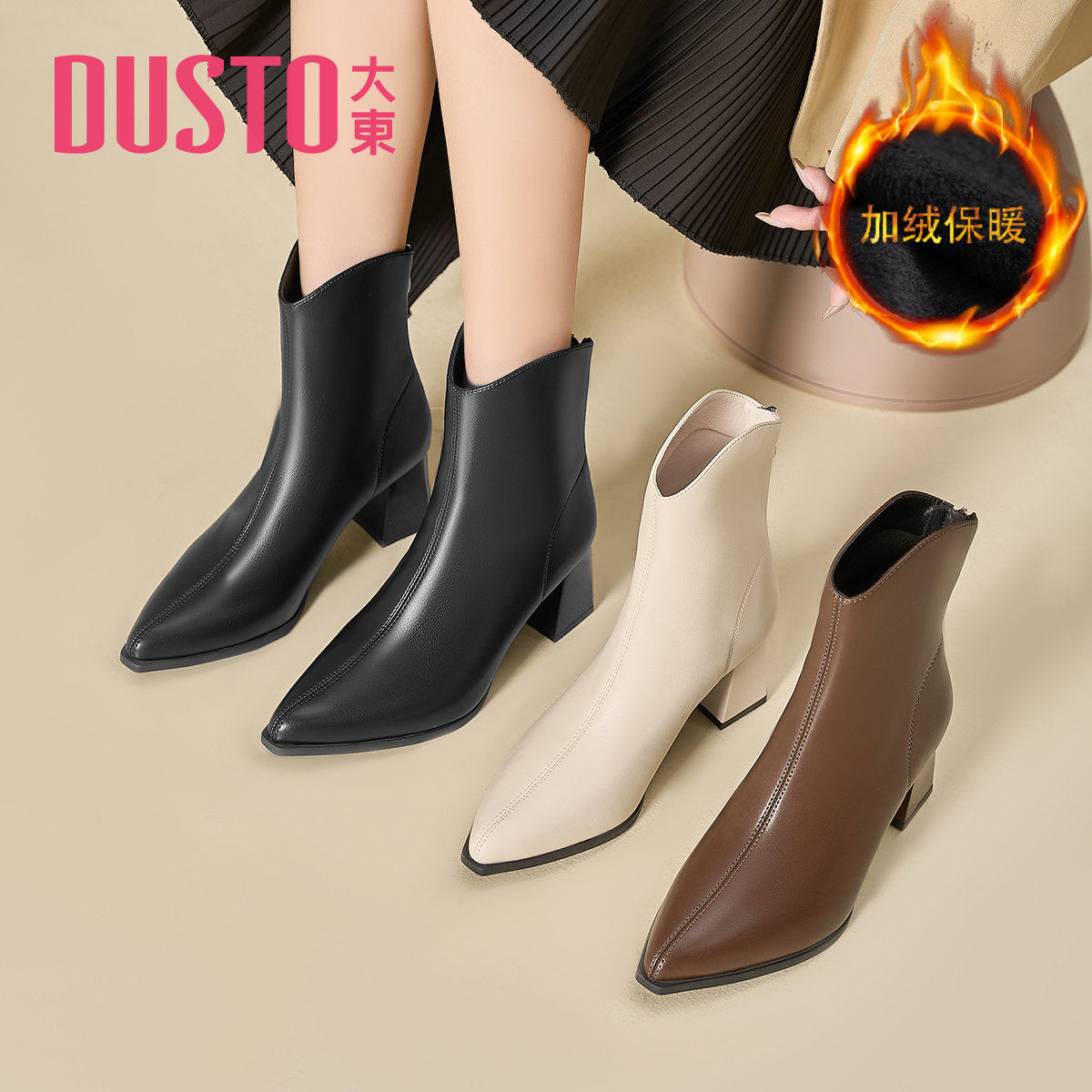 - 尖头短靴粗跟加绒