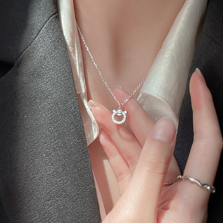 可爱戴蝴蝶结小熊项链 925纯银锆石锁骨链女简约学生闺蜜送礼物
