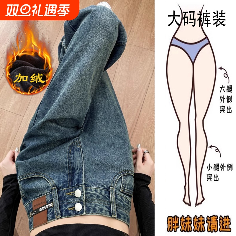 冬季大码胖mm加绒牛仔裤女高腰宽松显瘦慵懒风学生韩版直筒阔腿裤