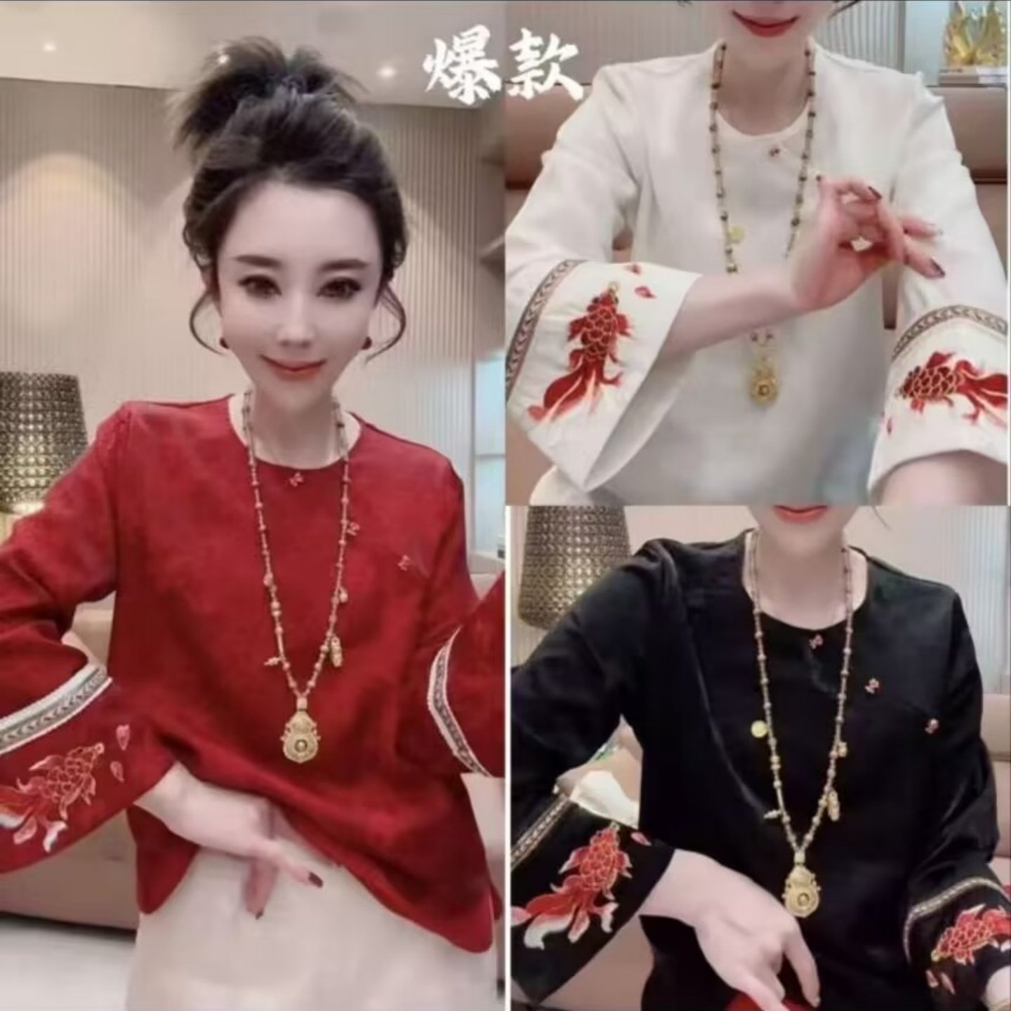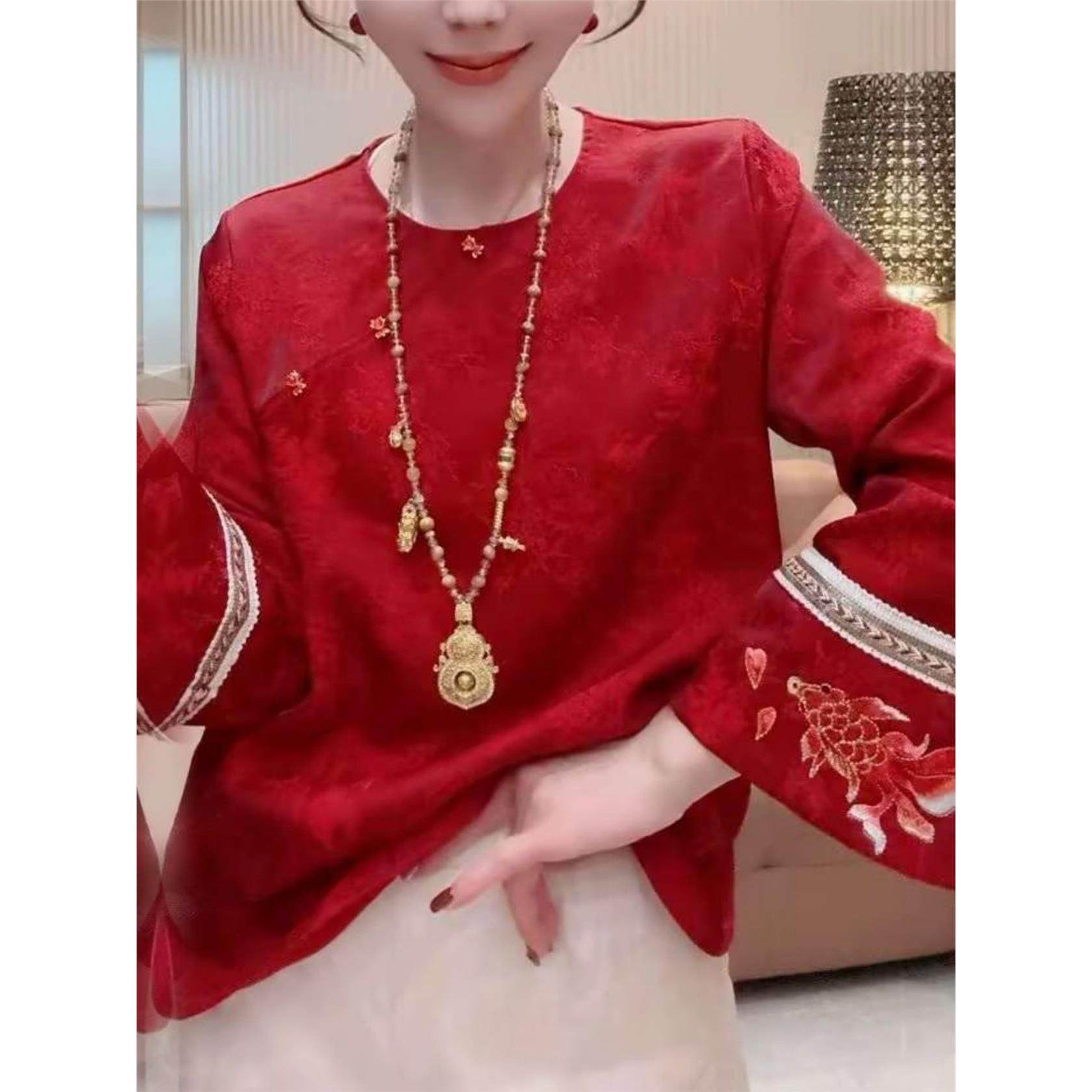 2026新年喜庆圆领百搭高级感显白喇叭袖锦鲤刺绣提花国风衬衫上衣