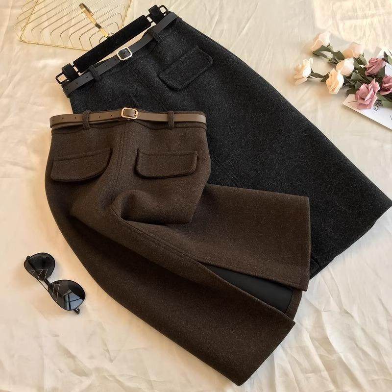 秋季新款高级感毛呢半身裙女中长款春天配毛衣高腰气质开叉包臀裙