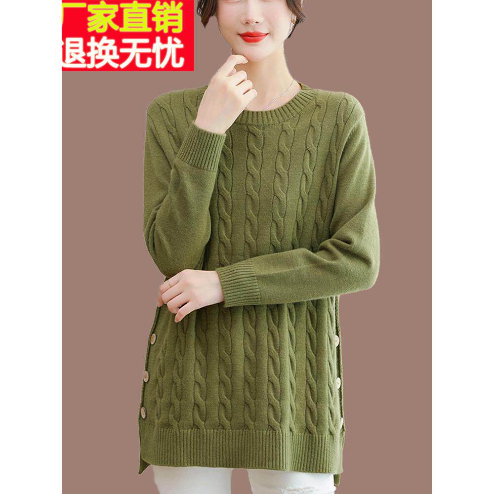 开叉毛衣女中长款圆领宽松显瘦大码200斤内搭麻花针织羊毛打底衫Y