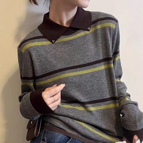复古拼色条纹翻领长修针织衫女2025秋冬新款袖口开叉时尚百搭毛衣