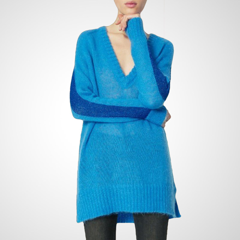 兰卡时尚V领开叉蓝色毛衣2025冬季新款宽松百搭气质中长款针织衫