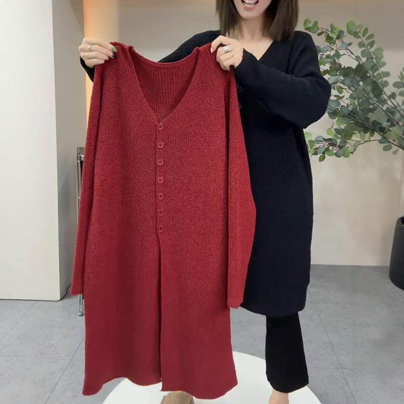 欧货慵懒风V领单排扣长袖毛衣开衫2024秋季新款宽松开叉中长上衣
