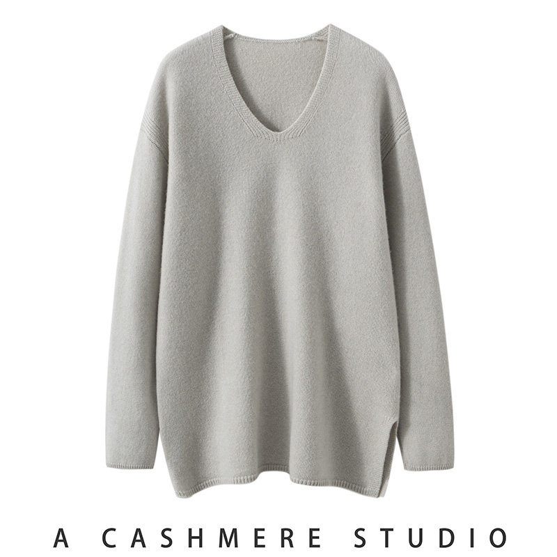V领中长款气质开叉山羊绒上衣宽松显瘦长袖针织打底别致小众毛衣