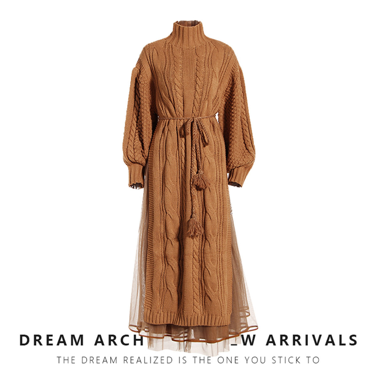 长款立领灯笼袖裙子2024春侧边开叉针织毛衣连衣裙网纱半裙两件套