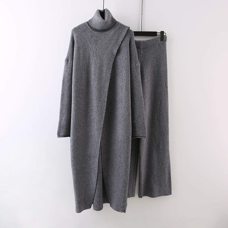 2022新款长款过膝毛衣秋冬开叉高领针织连衣裙+阔腿裤加厚套装女