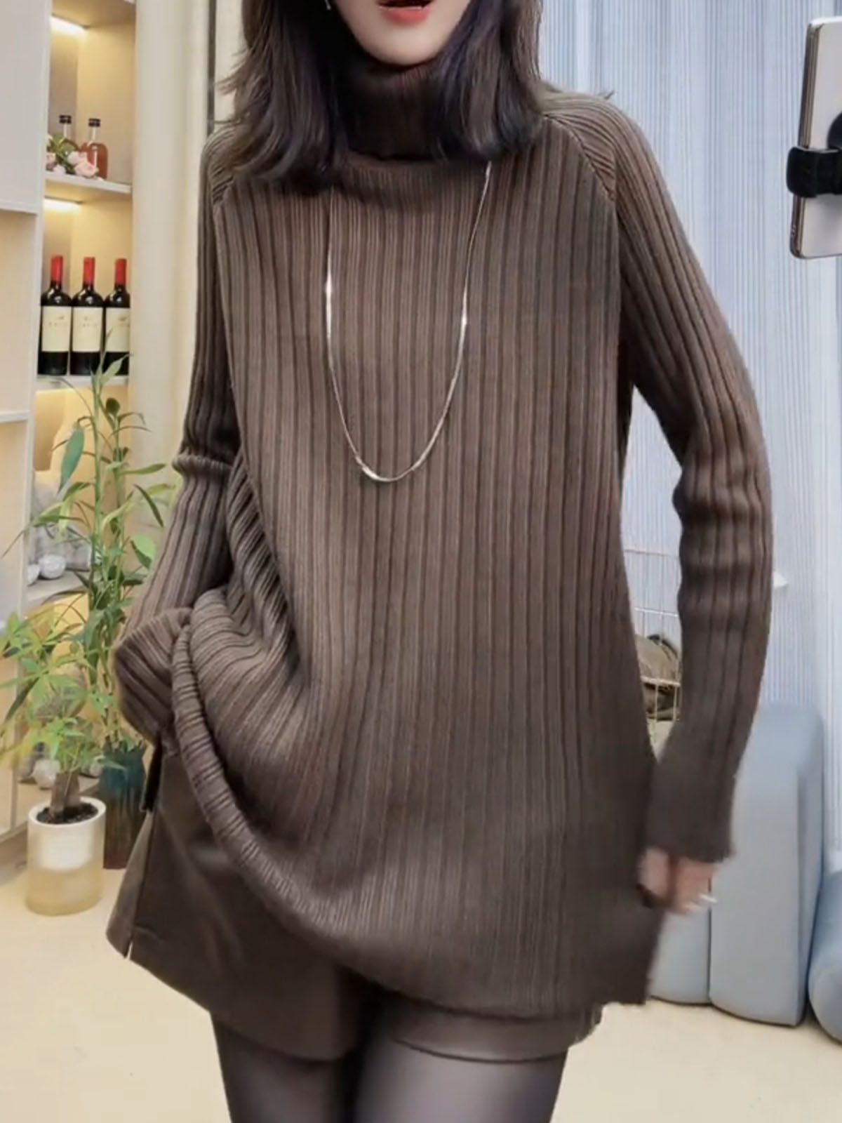 2025年秋冬新款毛衣中长款半高领洋气开叉针织毛衣女宽松打底衫女