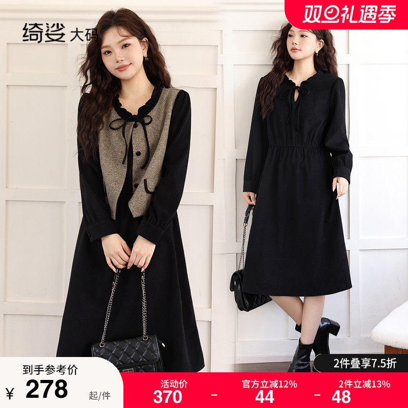 绮娑大码两件套装连衣裙冬季新款收腰遮肚子显瘦胖MM磨毛A字长裙