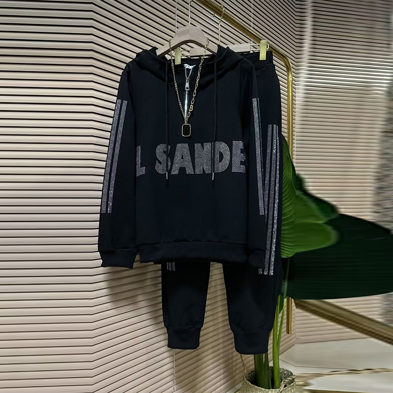 胖MM套装连帽烫钻字母上衣休闲裤加肥大码女装黑色显瘦简约两件套