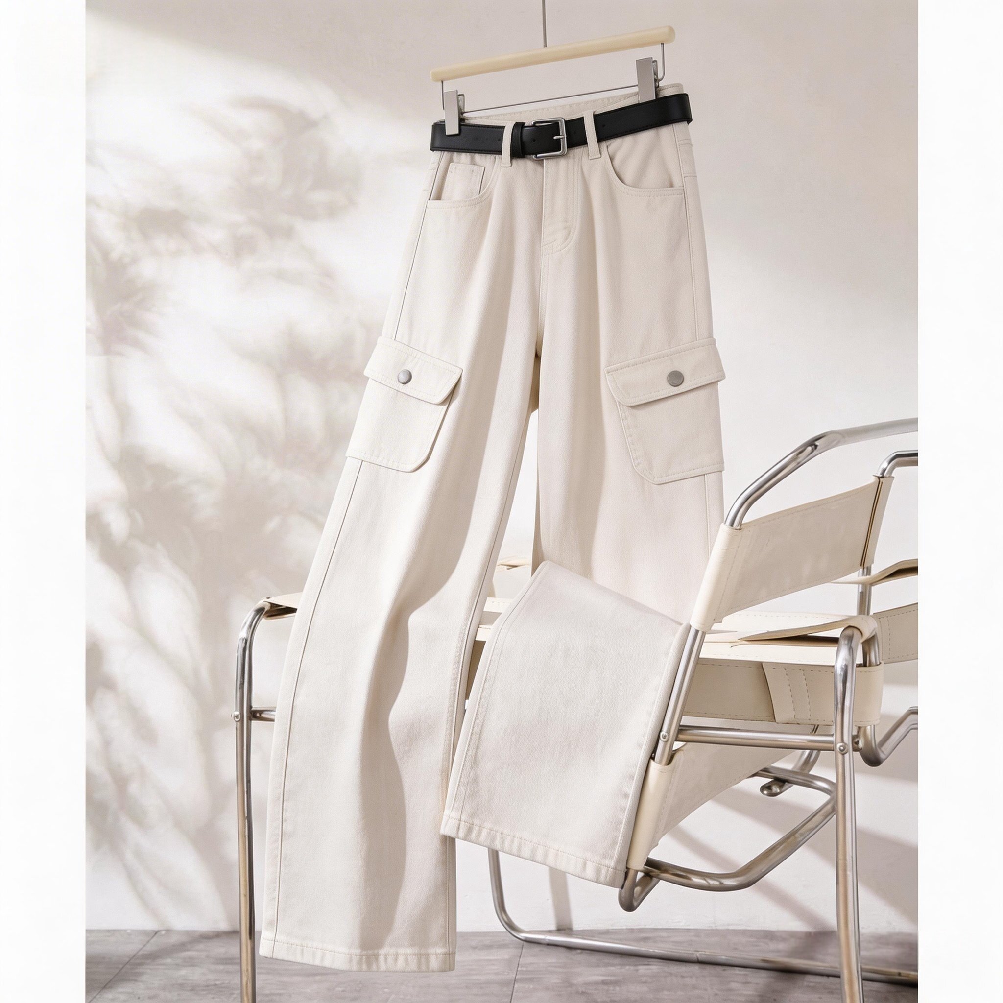 韩国高端复古多口袋设计感九分工装裤女小个子春季宽松阔腿牛仔裤