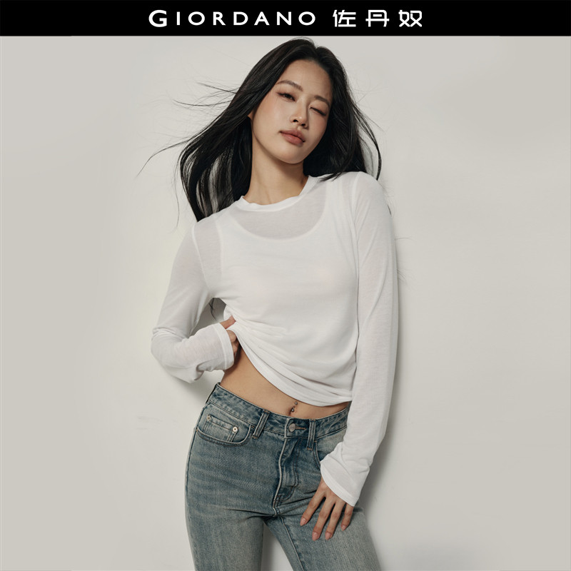 【韩国同款】佐丹奴2026年春弹力短款修身圆领长袖T恤女05325833