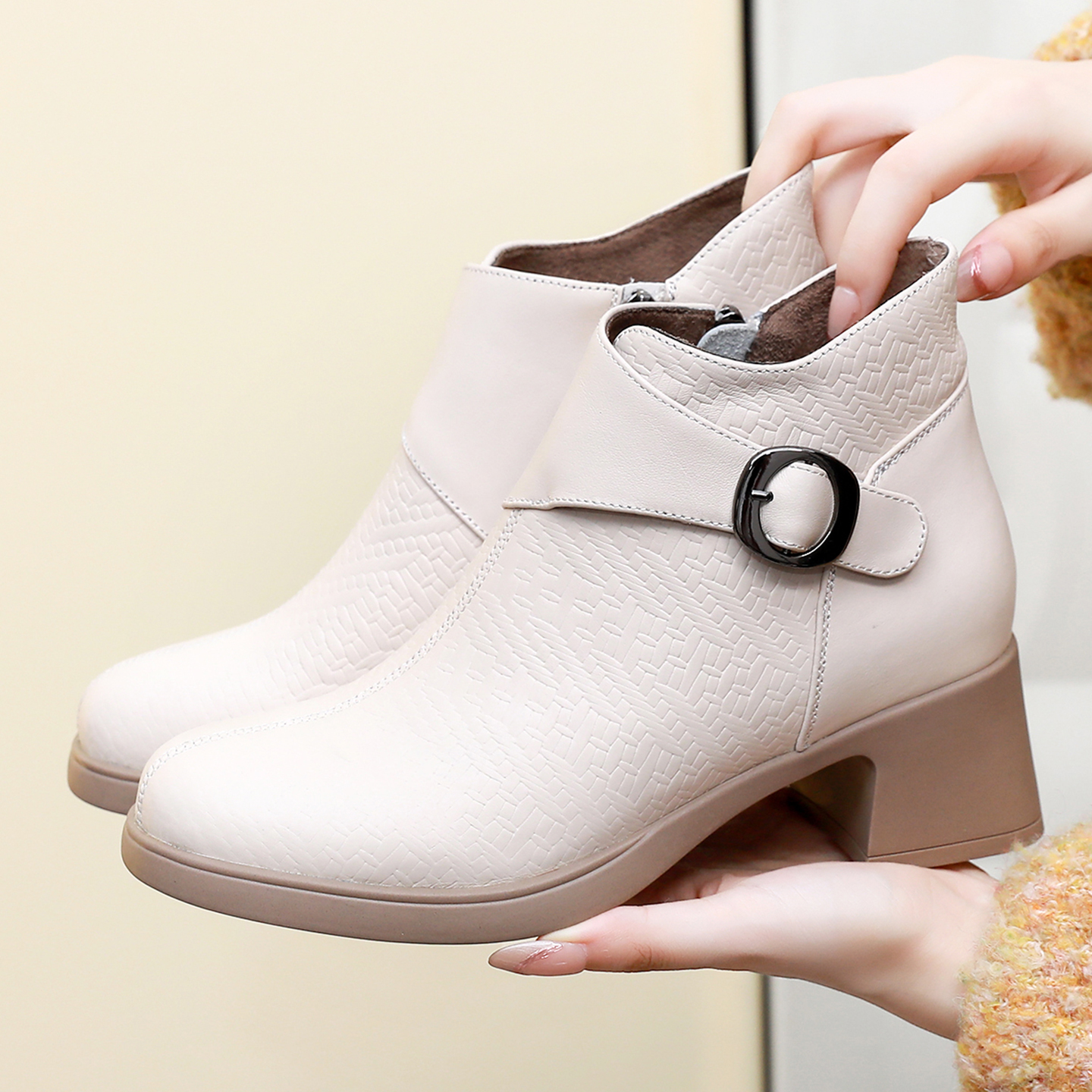 秋冬舒适粗跟小短靴女马丁靴中跟矮靴子大码真皮鞋子加绒妈妈棉鞋