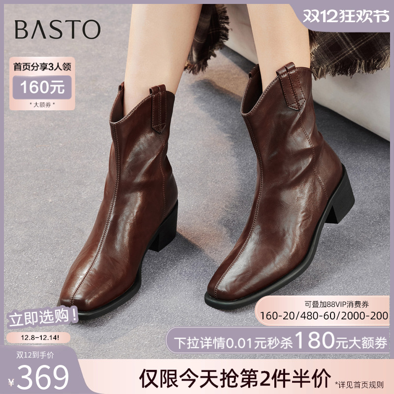 百思图2025冬商场新款气质显瘦V口骑士短靴粗跟女马丁靴B7206DZ5
