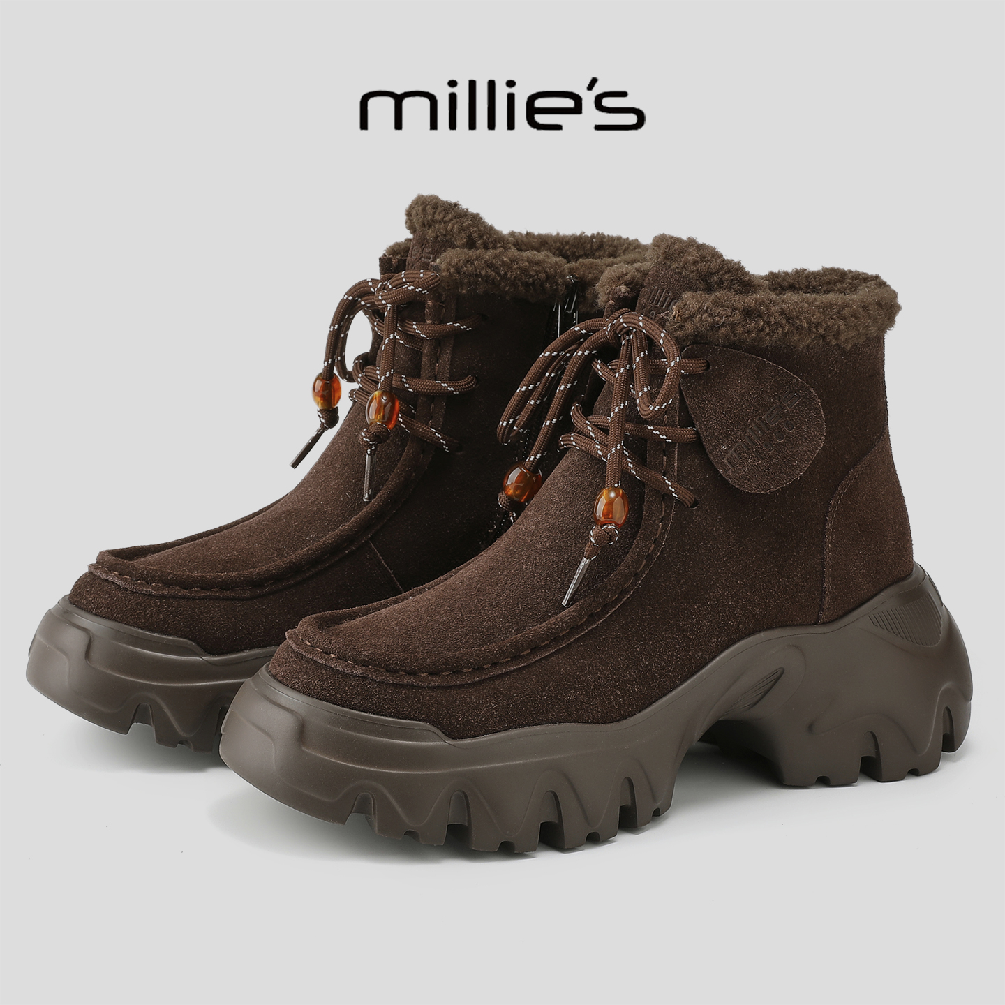 MILLIE'S/妙丽新款时尚百搭加绒保暖舒适厚底雪地靴系带女马丁靴