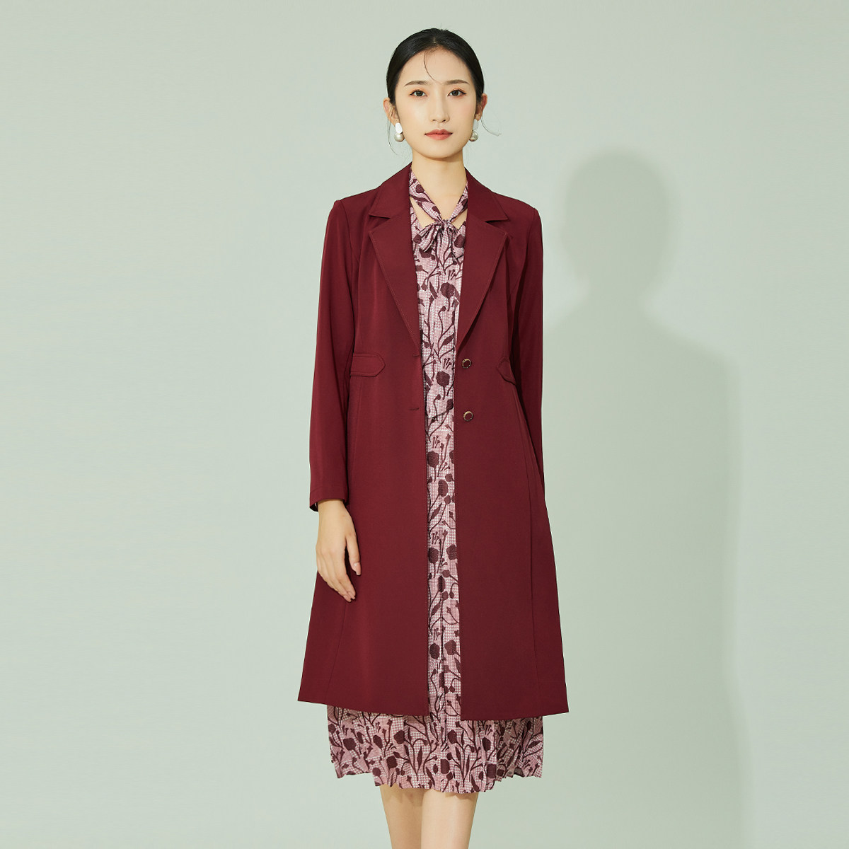 靓诺红色风衣女春秋新款小个子中长款西装领外套职业通勤LF22134A