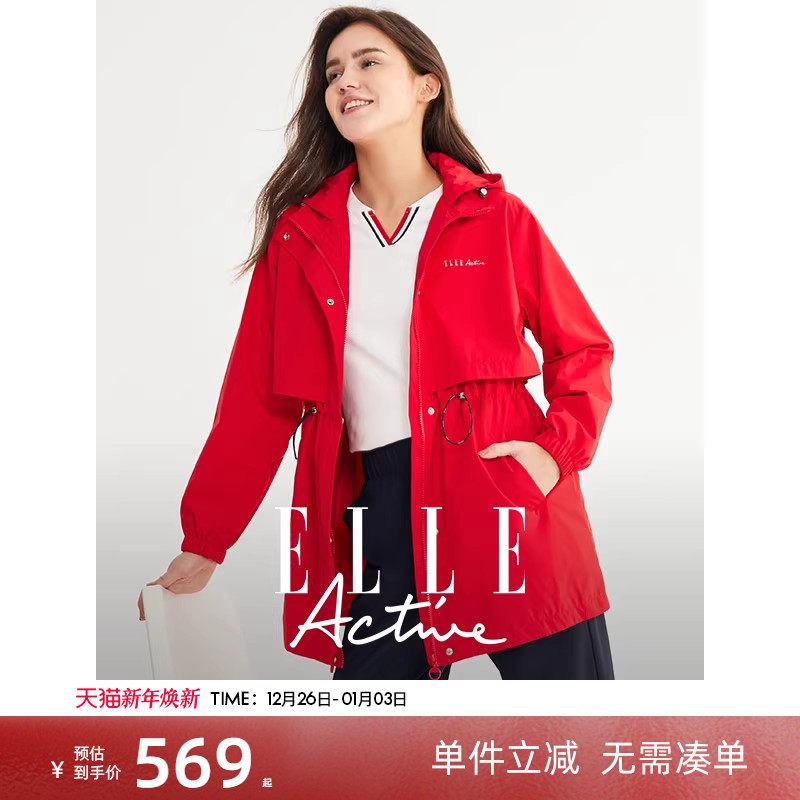 ELLE Active红色连帽风衣外套女中长款外套2025秋季新款防风大衣