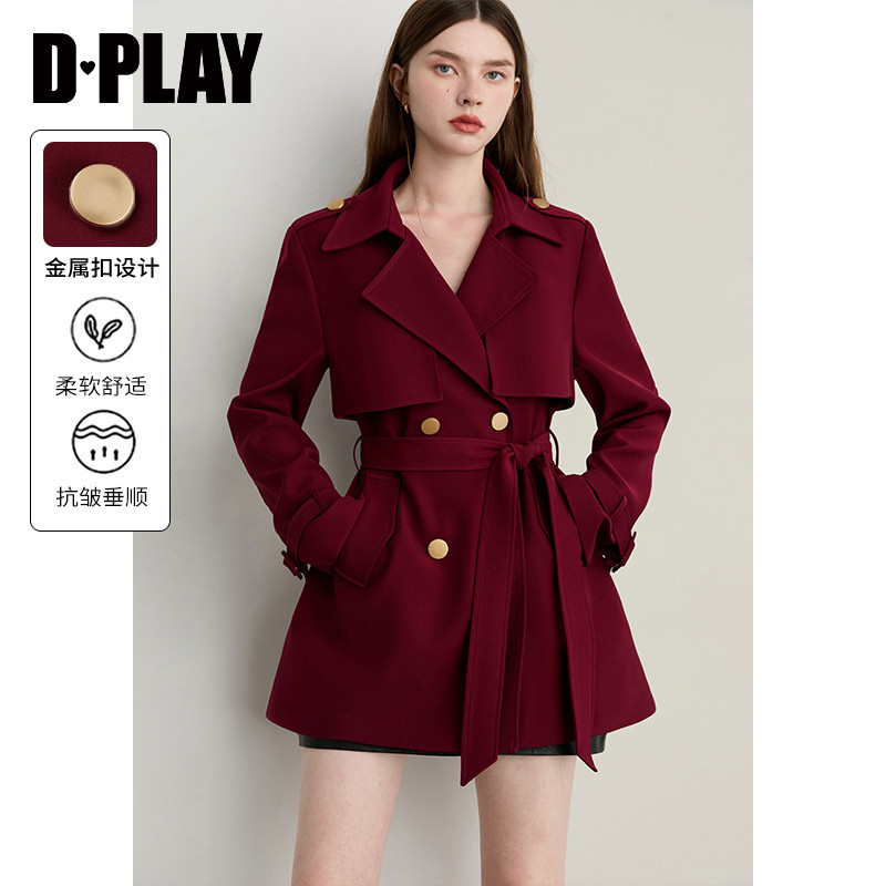 DPLAY2025年秋季新款红色风衣女洋气时髦气质短款宽松时装外套