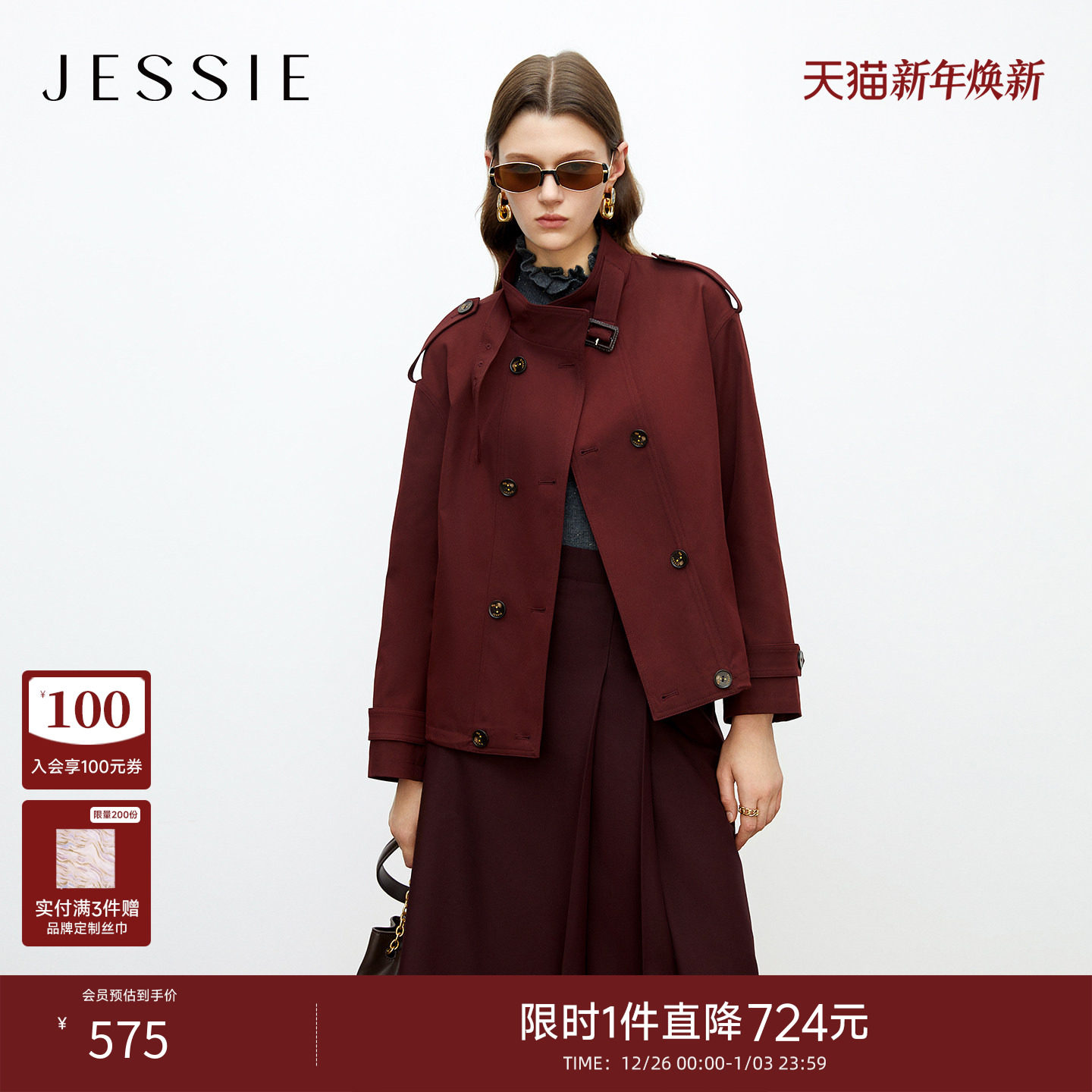 JESSIE2025年秋季新款红色百搭通勤抗皱短款风衣外套女立领肩章袖