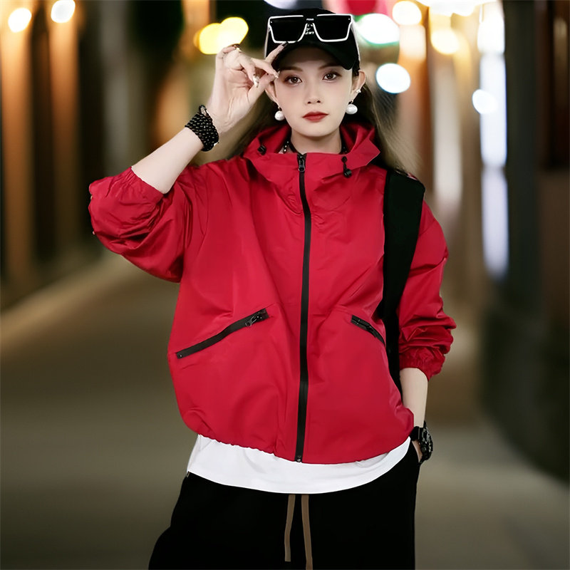 红色高级感短款外套女秋新款休闲宽松连帽运动风衣夹克减龄上衣潮