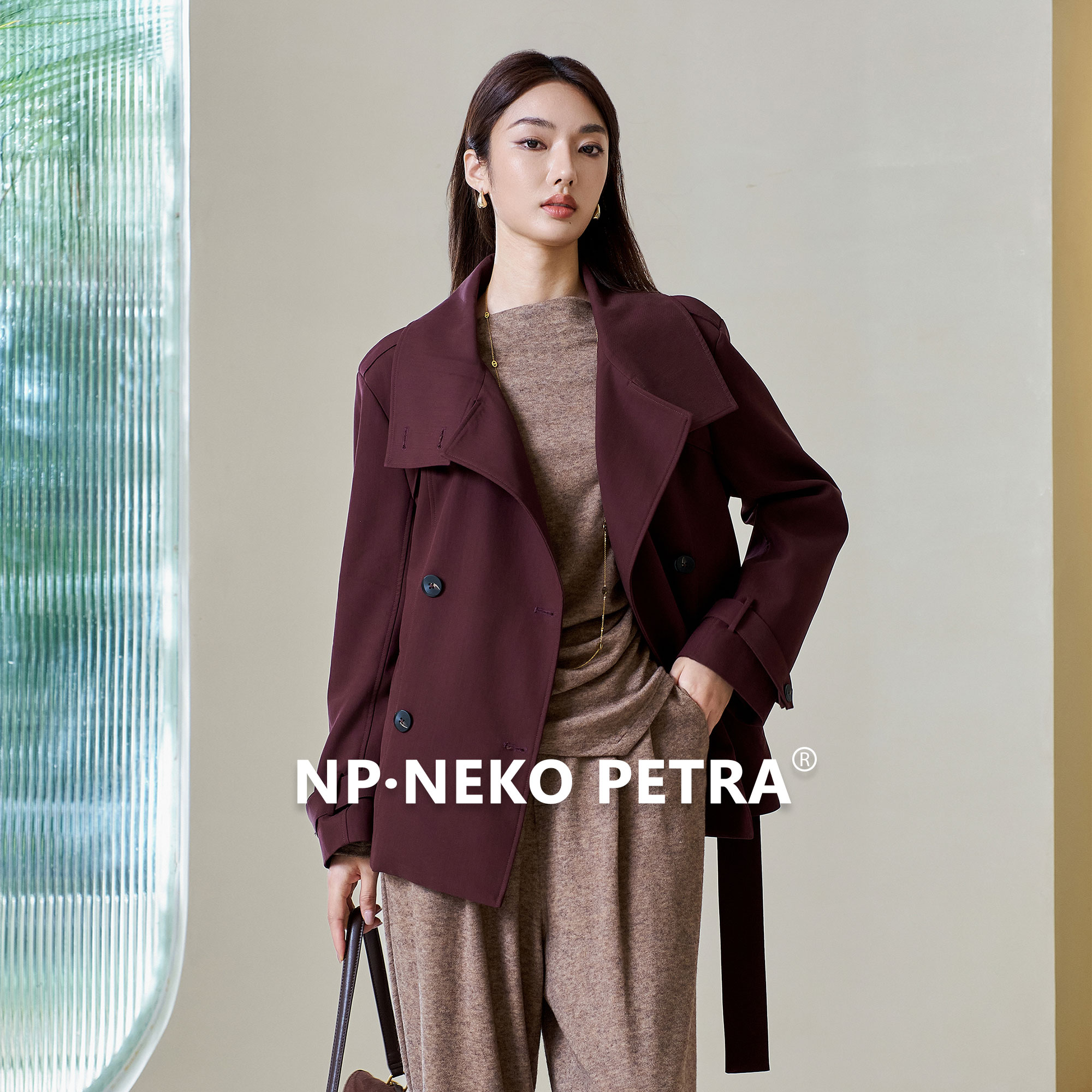 NekoPetra高级大翻领/立领短款安可拉红色风衣女秋系带双排扣外套