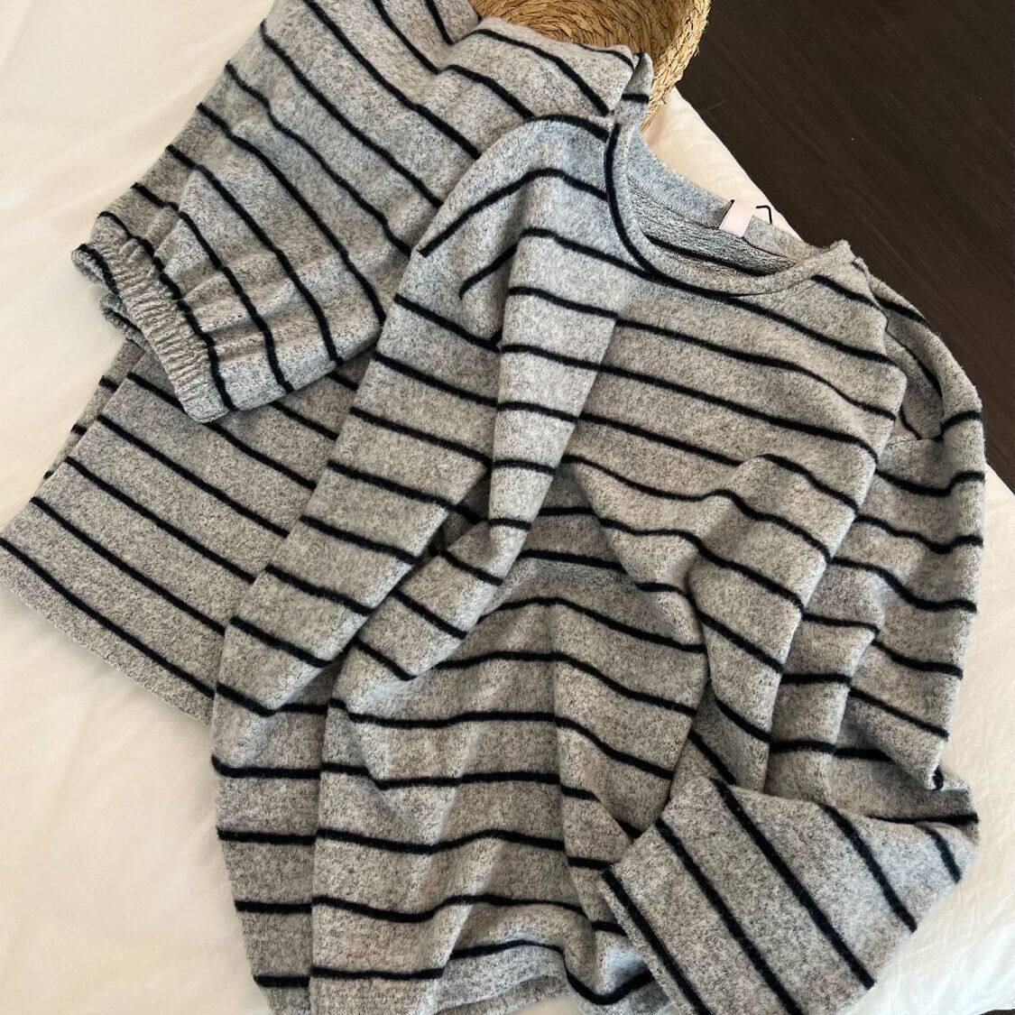 德绒保暖家居服套装女冬新款加绒条纹睡衣大码加厚开衫长裤两件套