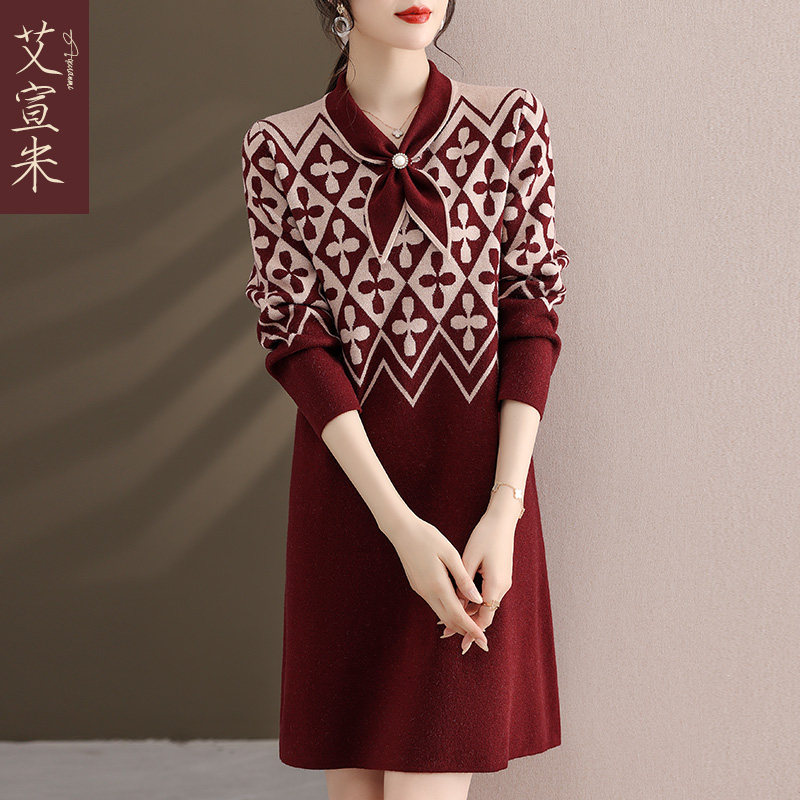 速发洋气妈妈连衣裙秋装20老4新款中2年打春秋针织士底毛衣裙中长