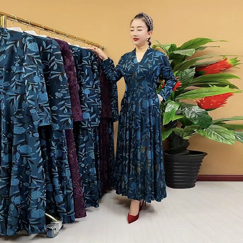 网红妈妈连衣裙秋冬新款金貂绒印花高腰显瘦加长款百搭牡丹花裙子