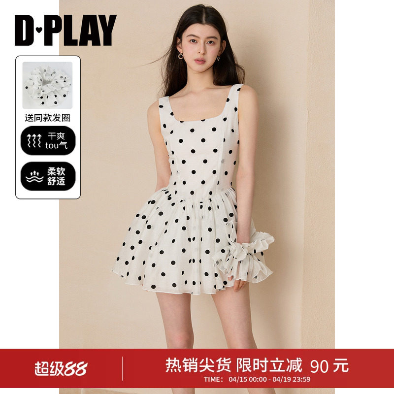 DPLAY白色波点裙方领收腰裙黑白波点吊带裙短裙2026年夏季连衣裙