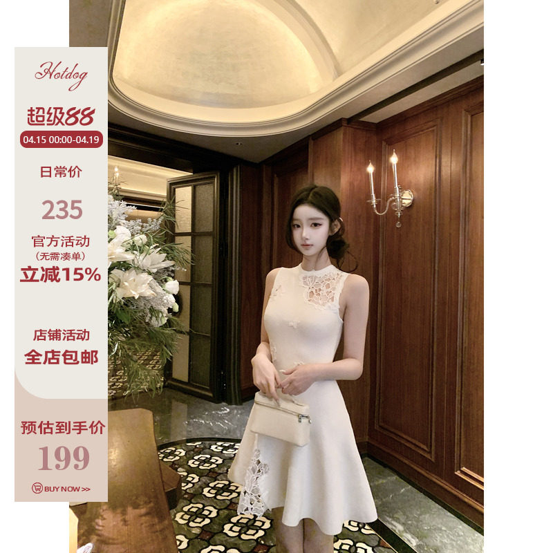 Hotdog 热狗很辣 【雪落蔷薇】白色蕾丝镂空设计感无袖连衣裙短裙