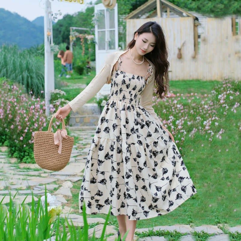 金苑2024夏新款今年流行开衫吊带长裙森系连衣裙两件套装G242186