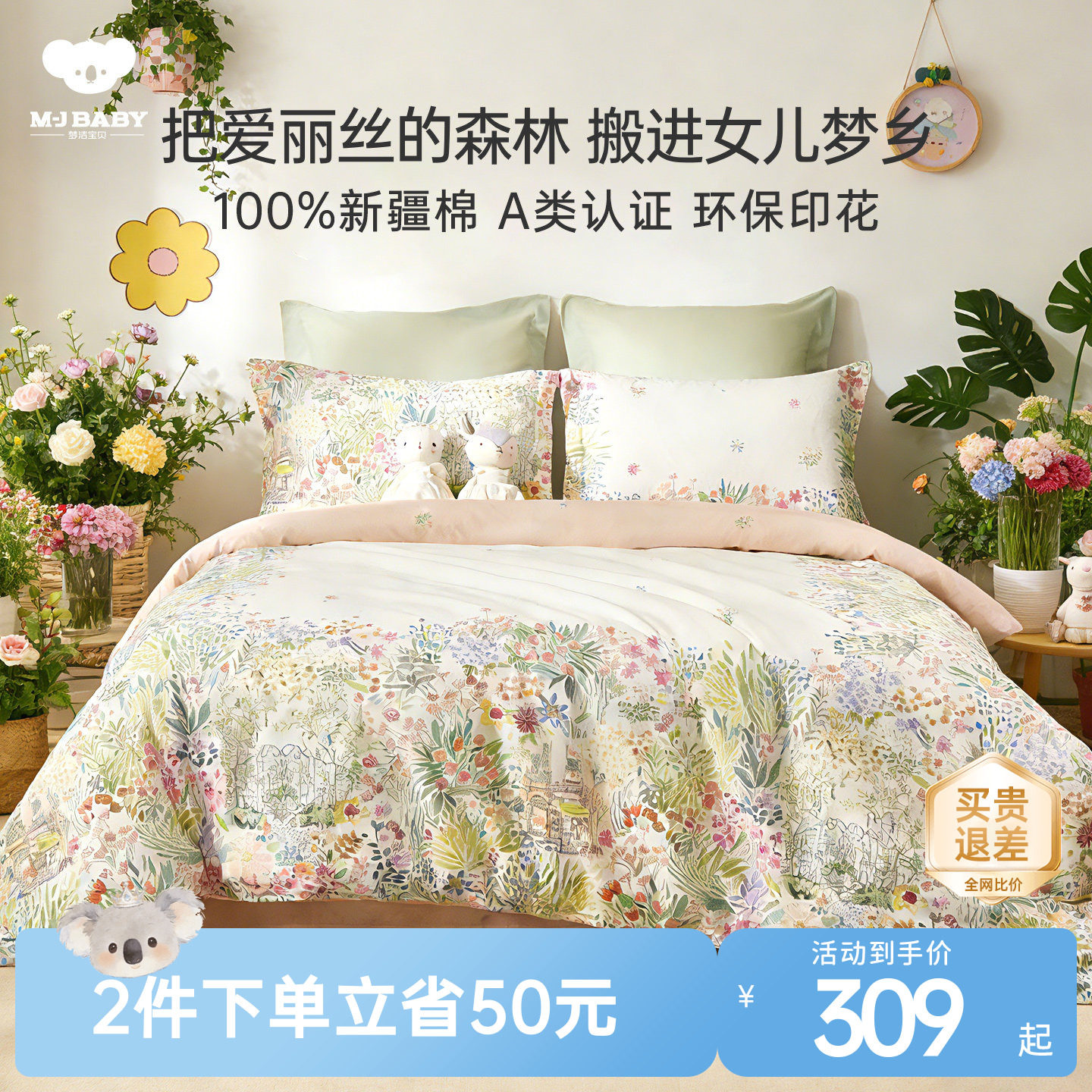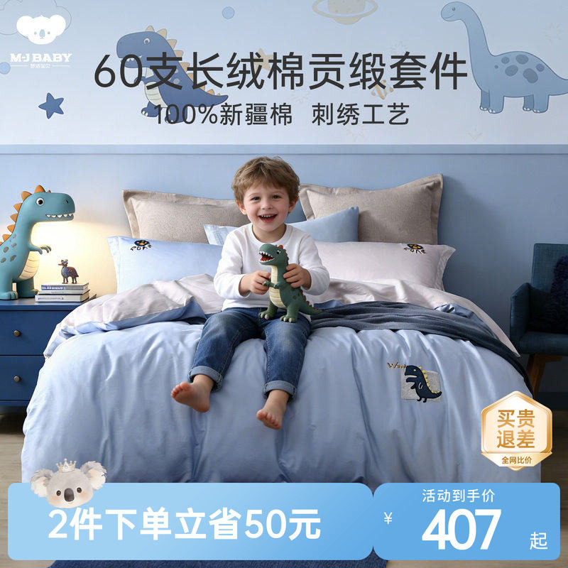 梦洁宝贝儿童四件套长绒棉纯棉贡缎男女孩全棉被套床上三件套正品