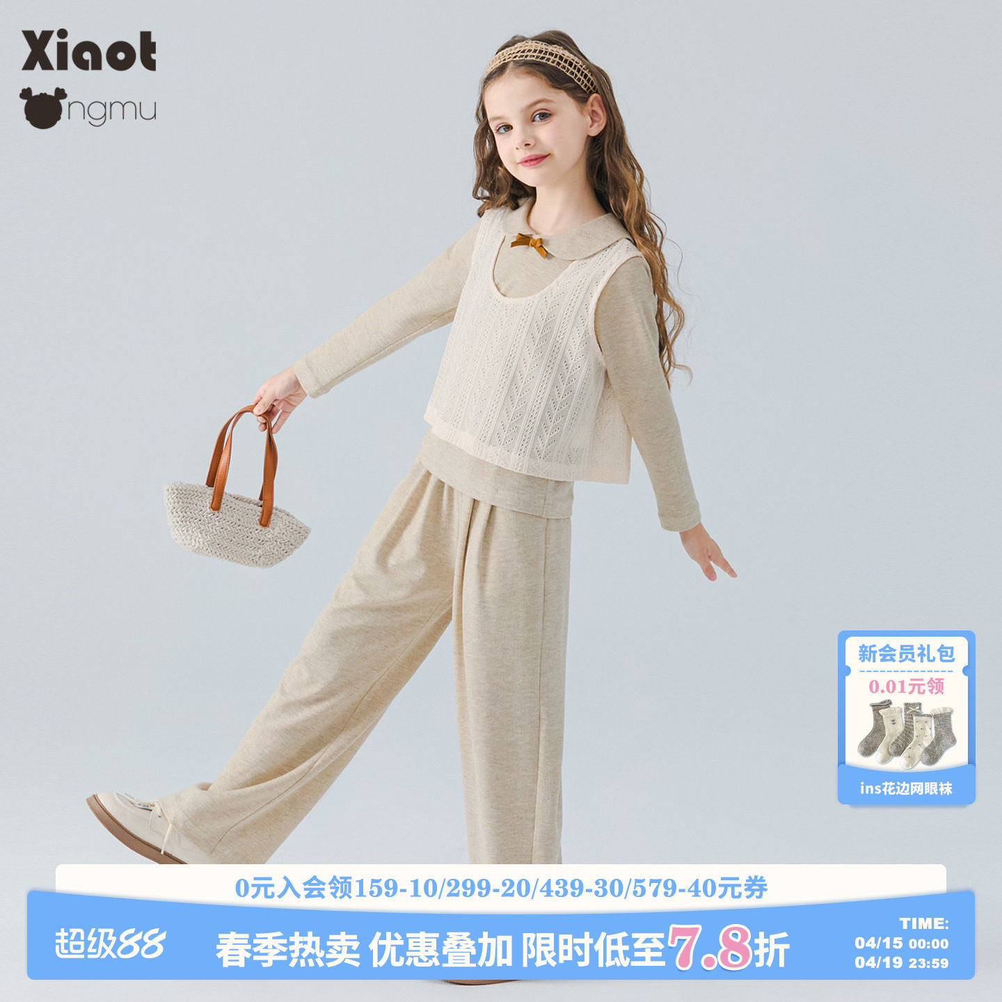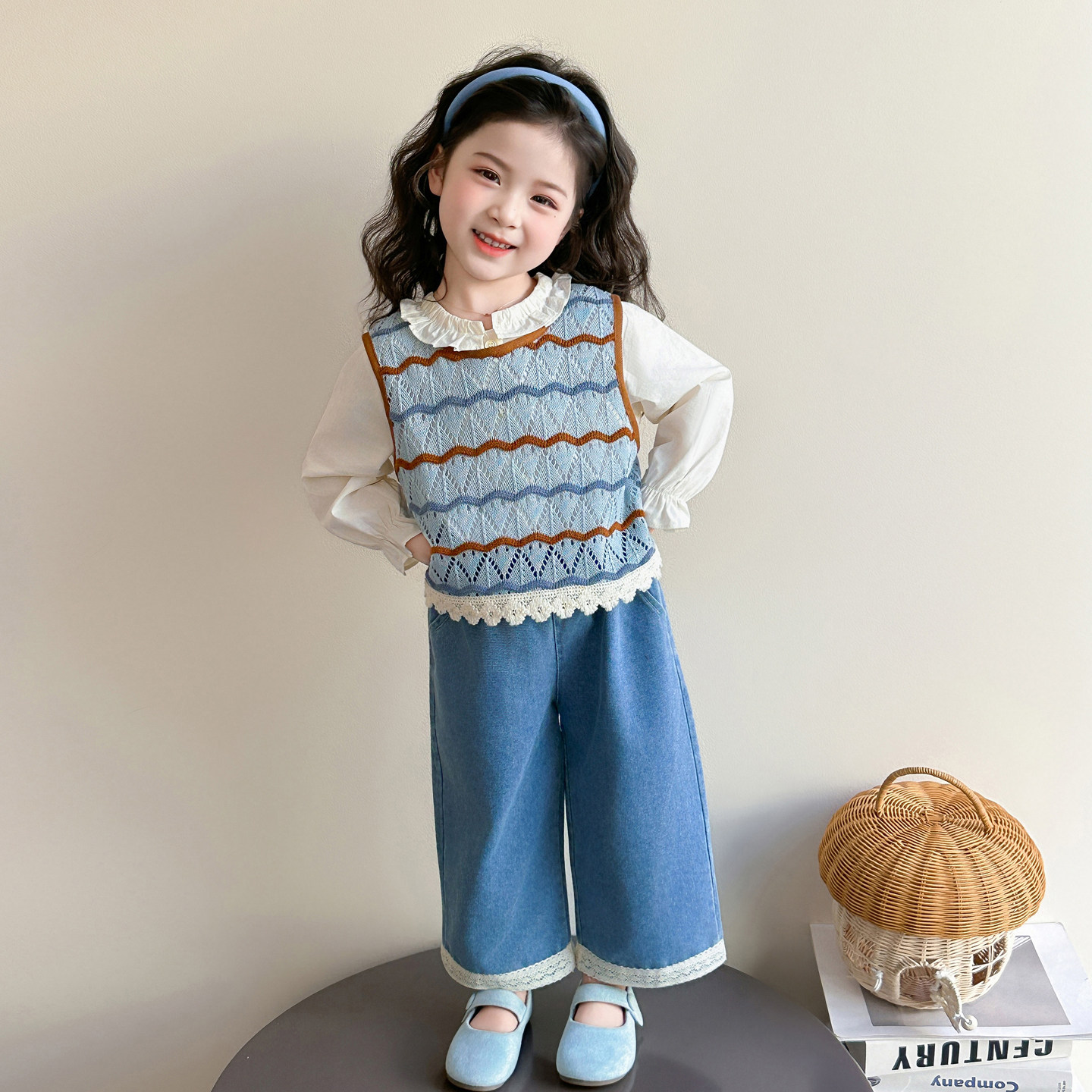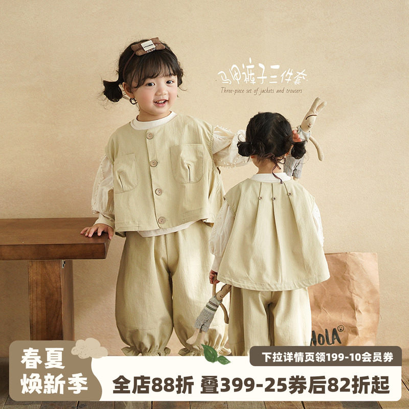 砚台家童装韩系女童洋气马甲套装春季新款女宝上衣裤子时髦三件套